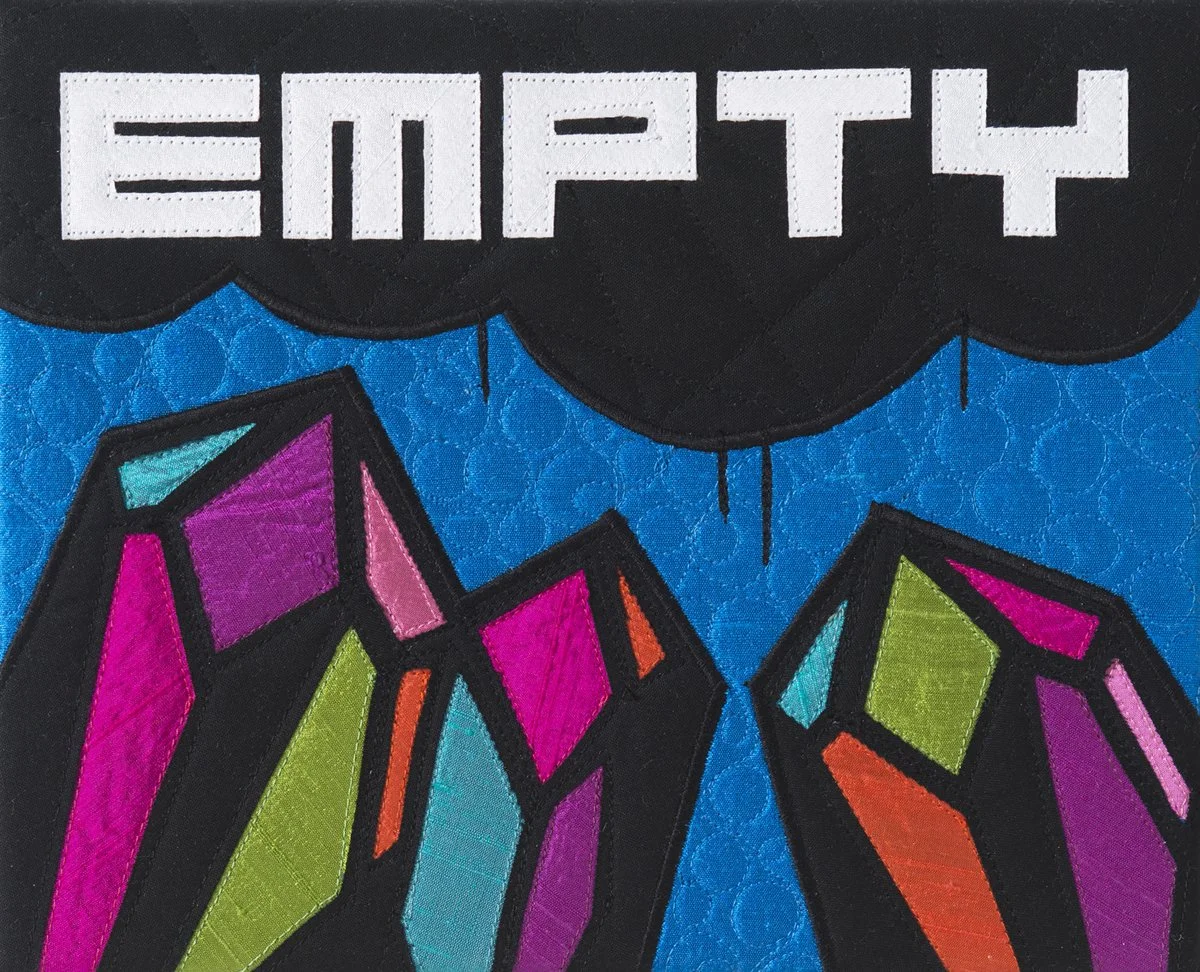 All or Nothing is also the title of a wall installation composed of twenty-six quilts. Each quilt features a word or phrase that appears often in my thoughts. Together, these quilts create a sense of the intensity and scale of my repetitive thoughts. The intention of this piece is to create visibility for people with anxiety and depression, and to promote open and honest conversations about mental health.
